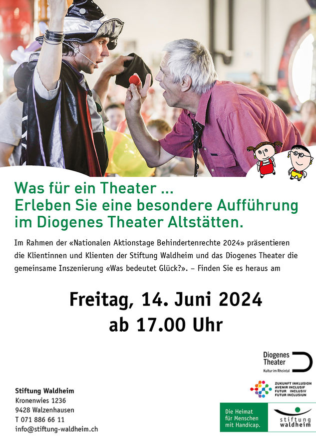 Unter dem Motto «Was bedeutet Glück?» haben sich Klientinnen und Klienten der Stiftung Waldheim mit Theaterschauspielern zusammengefunden, um mit ihren unterschiedlichen Fähigkeiten ein berührendes Theatererlebnis zu schaffen. Ihre kreative Zusammenarbeit führt zu einer ganz besonderen Inszenierung, die Herzen berührt und gleichzeitig auch tiefgründigen Fragen nachgeht. Denn die Frage nach dem Glück bewegt alle Menschen, da sie das Streben nach innerer Zufriedenheit, Erfüllung und Wohlbefinden betrifft.