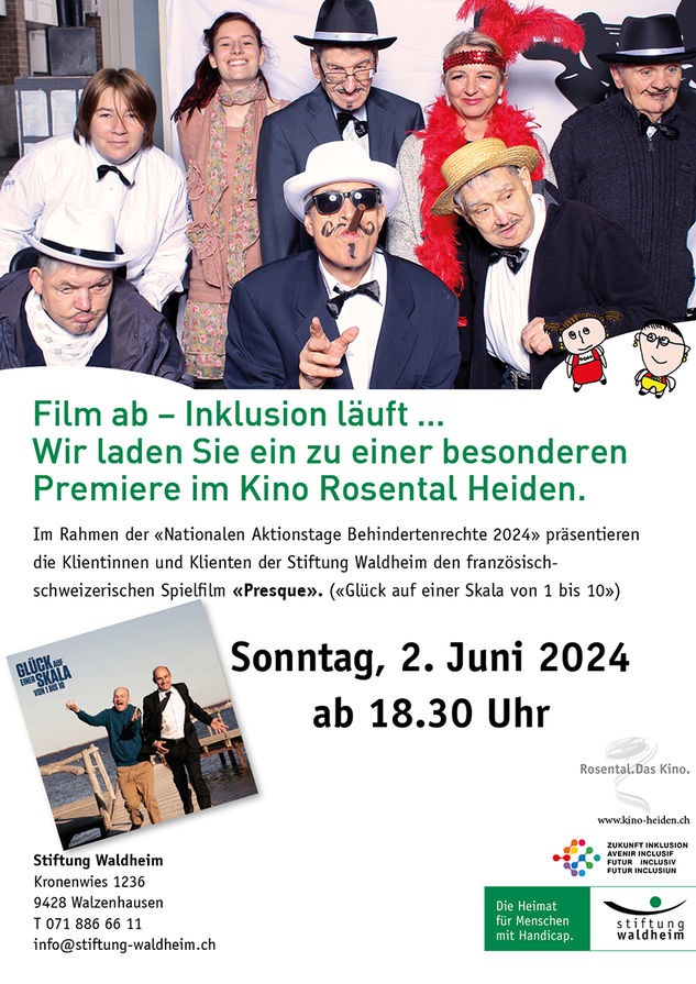 Die Klientinnen und Klienten der Stiftung Waldheim übernehmen für einmal das Kino Rosental in Heiden und gestalten es zu einem integrativen Betrieb um. Es werden Tickets verkauft, Projektoren hochgefahren, Filme eingelegt und die Kinobesucher mit Popcorn und Getränken versorgt. Passend dazu zeigt das Kino den französisch-schweizerischen Spielfilm «Presque» («Glück auf einer Skala von 1 bis 10»). Der Film zeigt auf humoristische aber auch tiefgründige Art, wie der verschlossene Leichenbestatter Louis und der philosophisch gebildete, aber durch eine zerebrale Lähmung körperlich beeinträchtigte Igor während eines Roadtrips von Lausanne nach Südfrankreich die Welt des jeweils anderen verstehen und akzeptieren lernen.