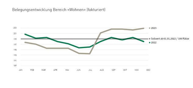 Das Plansoll, welches jeweils der kostendeckenden Tarifkalkulation zugrunde gelegt wird, liegt bei 98,0 % Auslastung. Das Ertragsbudget 2023 wurde um rund CHF 211’000 unterschritten. Die Ertragsbudgets wurden nicht erreicht, weil sich die Belegung wider Erwarten erst ab Juli 2023 markant verbesserte, wie die untenstehende Grafik verdeutlicht. Die Klientenfluktuation 2023 bewegt sich mit einem Plus von 4 im positiven Bereich. 17 Eintritten standen 7 Todesfälle und 6 Austritte gegenüber. Zum Vergleich: Im Vorjahr waren 12 Eintritte sowie 9 Todesfälle und 4 Austritte und letztlich ein Rückgang von minus 1 zu verzeichnen.