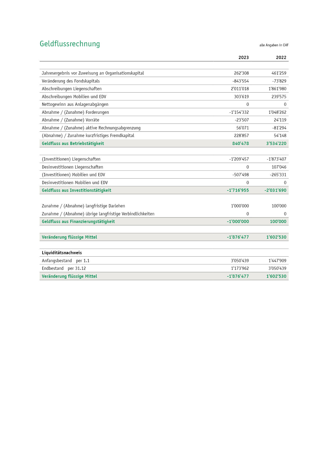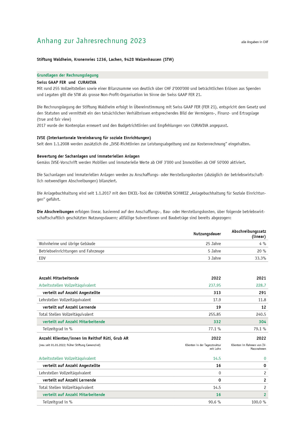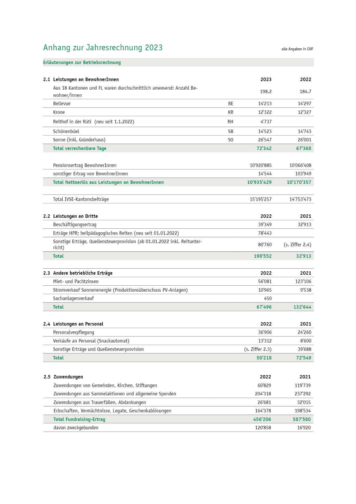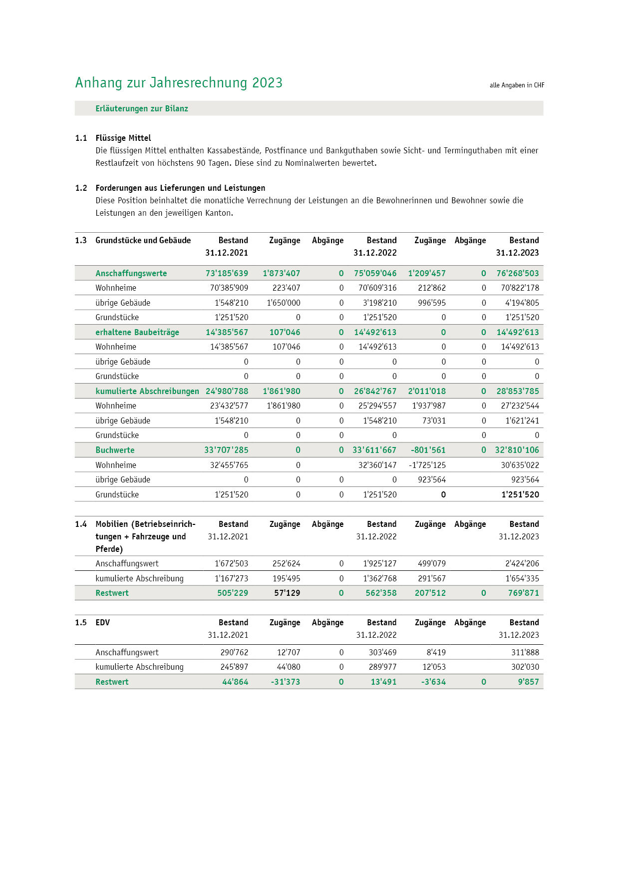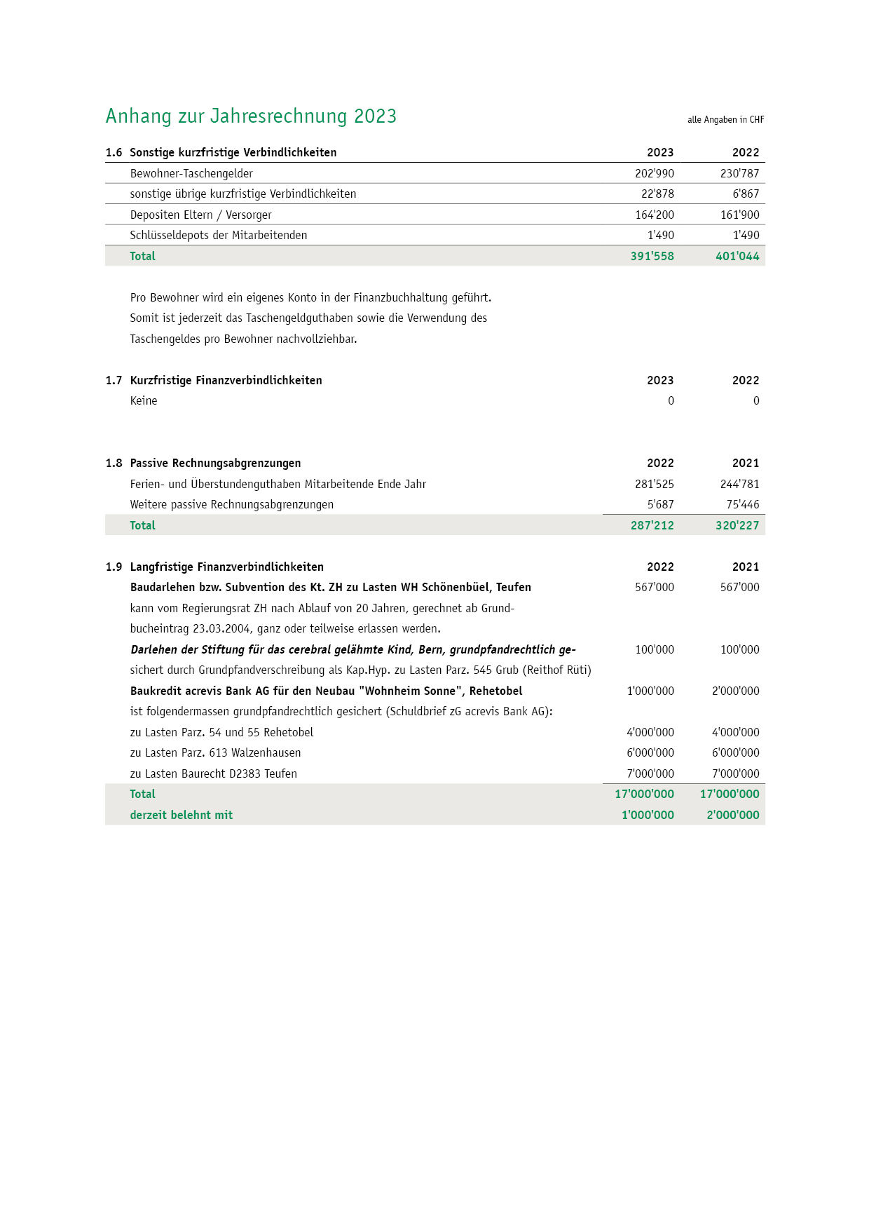 Für den Stall-Neubau und die Areal-Neugestaltung beim Wohnheim Bellevue, Walzenhausen, wurde bis 31. Dezember 2023 ein Betrag von CHF 2.5 Mio. investiert: 1.6 Mio. im Jahr 2023 und 0.9 Mio. in den Vorjahren 2021/22. Beim Wohnheim Schönenbüel, Teufen wurden CHF 0.5 Mio. in die neue Wärmepumpen-Heiz- und PV-Anlage und beim Wohnheim Krone, Walzenhausen knapp 0.3 Mio. in die Total-Erneuerung der Beleuchtungen sowie der Akustikdecken in den Wohngruppen- Bereichen investiert. Der laufende Baukredit beträgt per 31. Dezember 2023 insgesamt CHF 2 Mio.; resultierend aus 1 Mio. für die Resthypothek «Neubau Wohnheim Sonne», Rehetobel und seit 12. Dezember 2023 1 Mio. für Investitionen beim Wohnheim Bellevue, Walzenhausen.