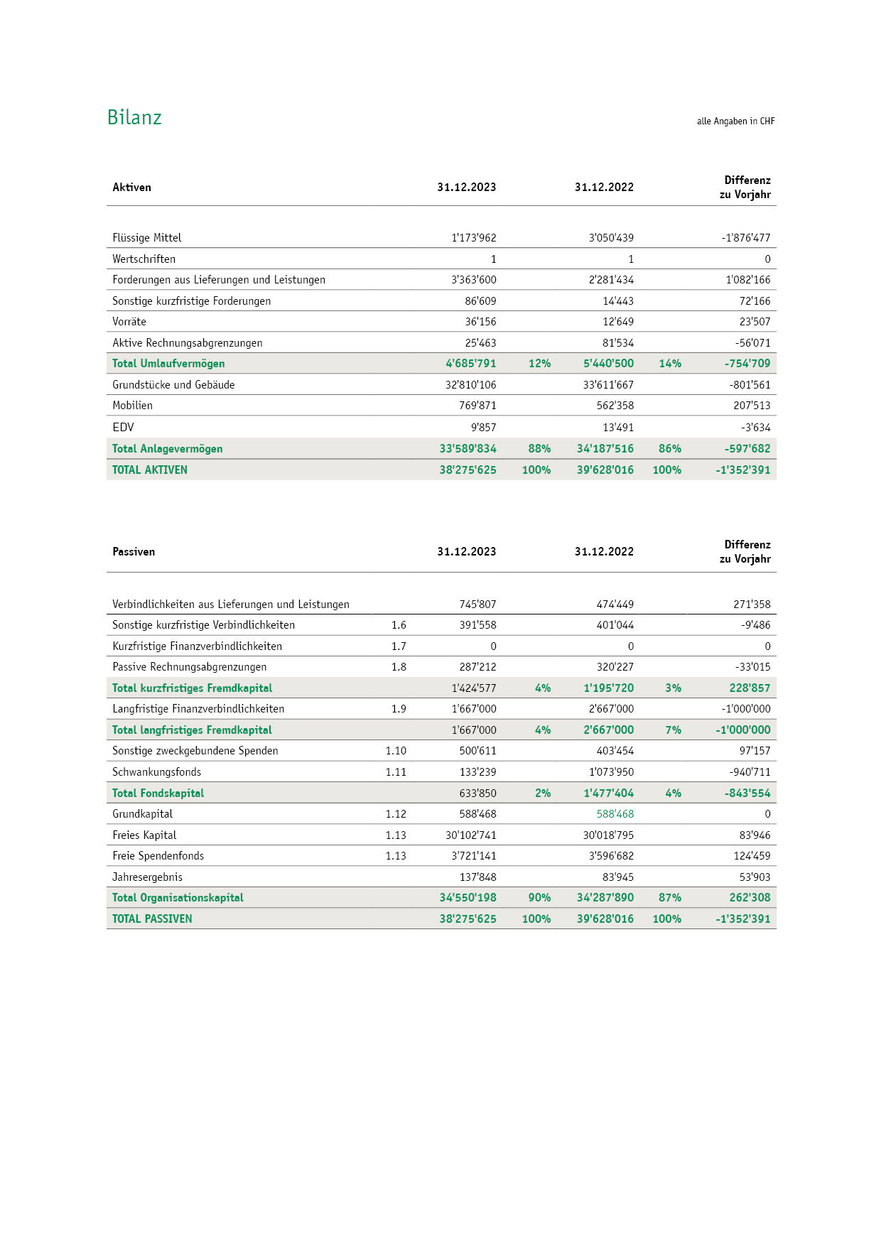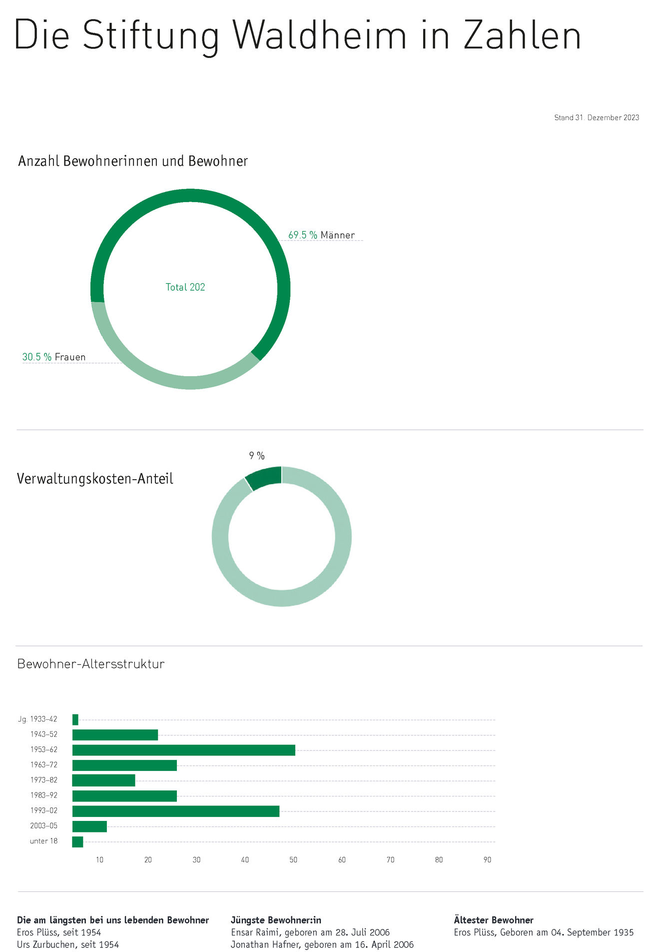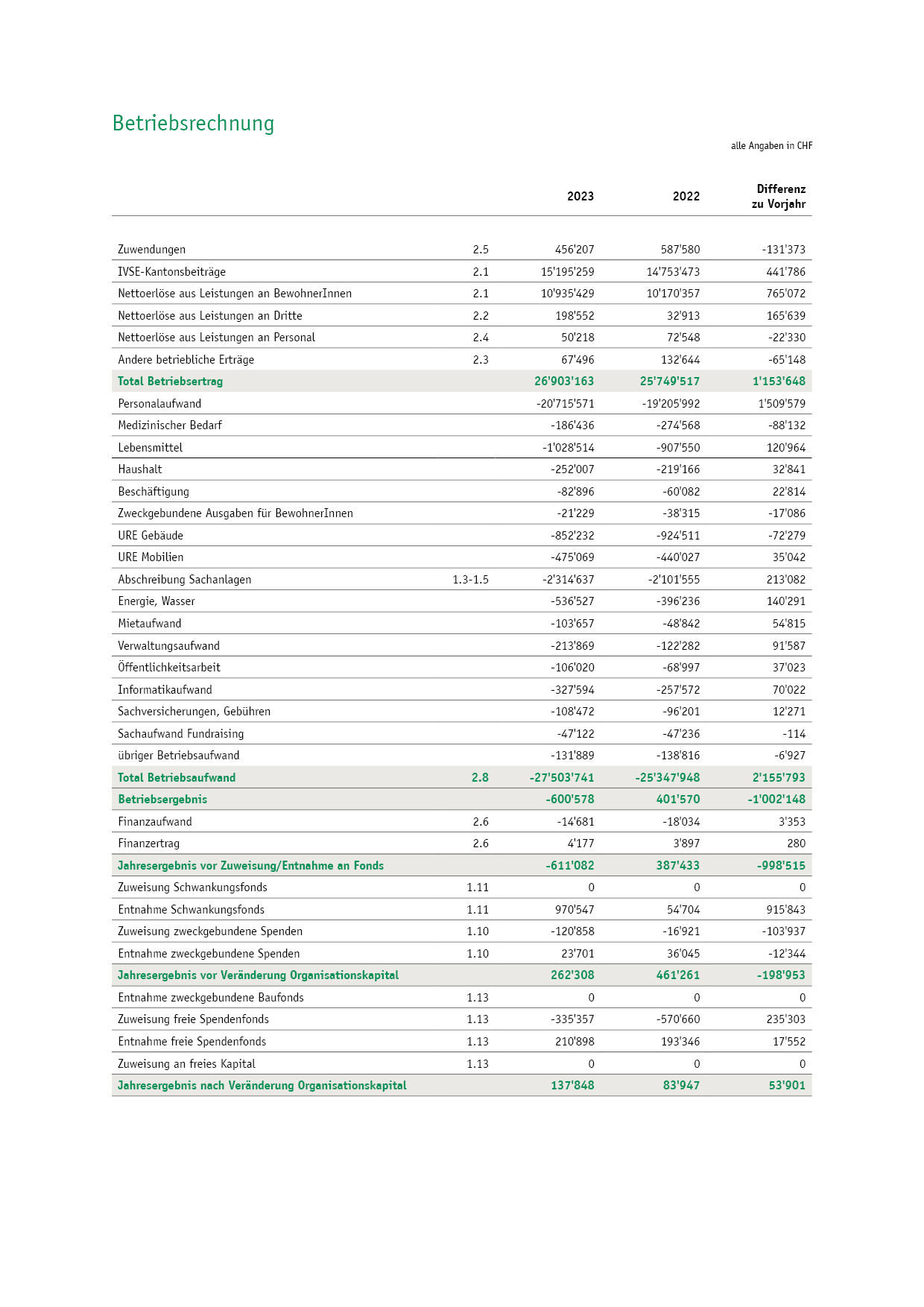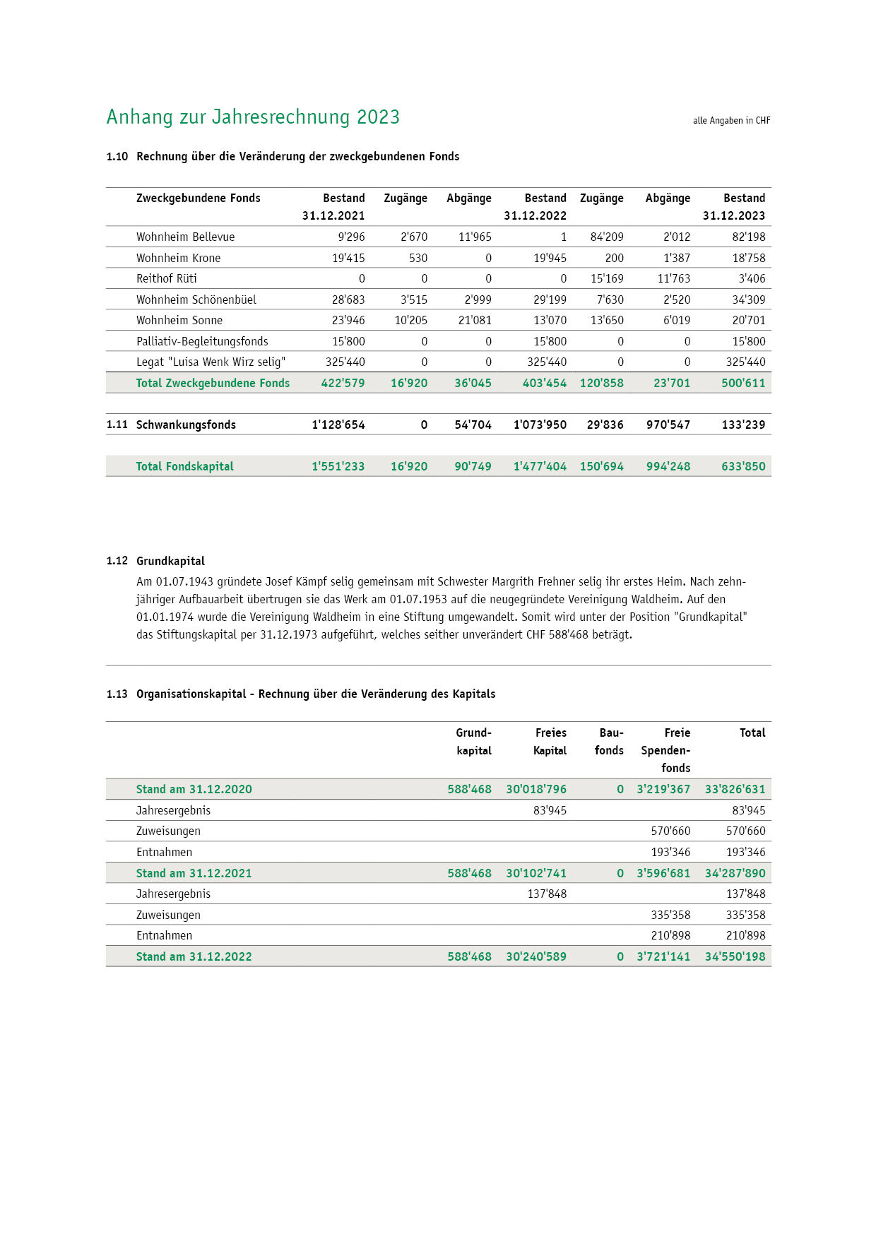 Die Stiftung Waldheim schliesst das Geschäftsjahr 2023 mit einem negativen Jahresergebnis von CHF 180’407 ab. Den Schwankungsfonds wurden netto CHF 133'239 entnommen; damit sind diese nun aufgebraucht. In die zweckgebundenen und freien Spendenfonds wurden netto CHF 69’966 eingelegt. Ohne diese Fondsbezüge und Fondseinlagen zeigt die Betriebsrechnung 2023 einen Aufwandüberschuss von CHF 243’679.