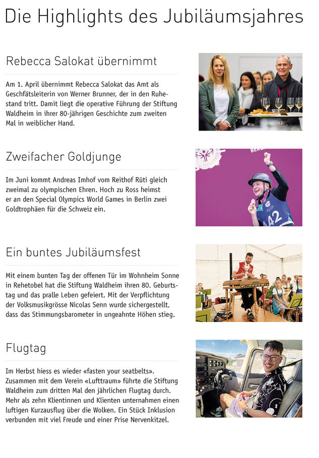 2023 war ein bemerkenswertes Jahr für die Stiftung Waldheim. Ein spannendes Jahr, das sowohl von Kontinuität als auch von Veränderung geprägt war. Im Frühjahr übernahm Rebecca Salokat von Werner Brunner das Amt der Geschäftsleiterin und Ende Jahr trat Luana Maffeo die Nachfolge von Lionel Monnet als Heimleiterin des Wohnheims Schönenbüel an. Gleichzeitig feierte die Stiftung Waldheim ihr 80-jähriges Bestehen.