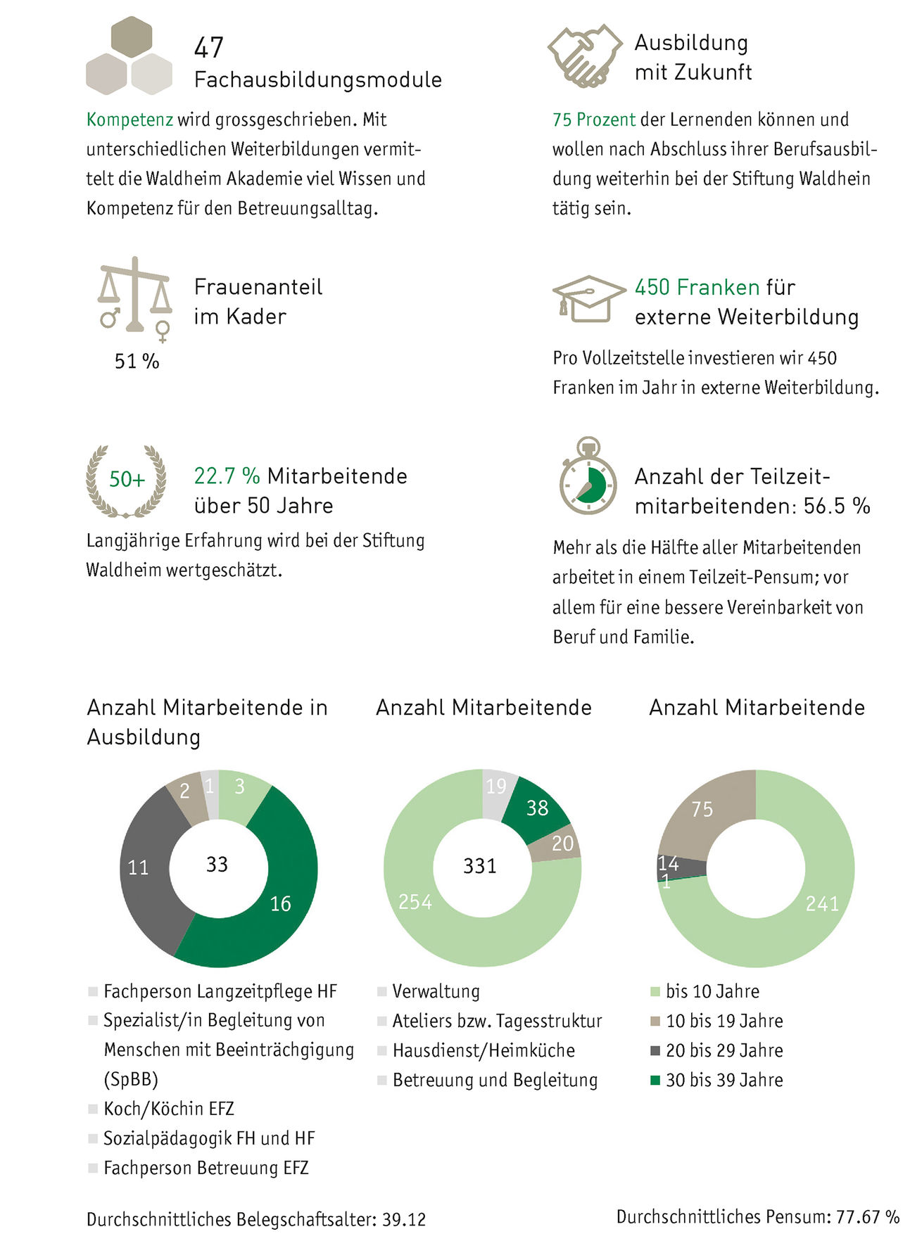 Um die Ausstrahlung als attraktive Arbeitgeberin weiter zu festigen, werden wir den Fokus in der Stiftung Waldheim noch stärker auf die Mitarbeitenden richten. Dies aus gutem Grund, denn unser Anspruch ist und bleibt es, allen Klientinnen und Klienten hochwertige und einzigartige Dienstleistungen anzubieten.