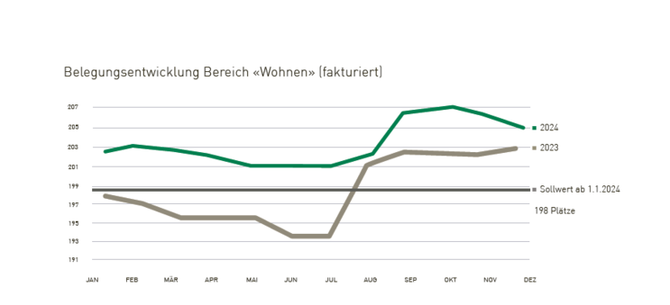 Die Erträge waren immer deutlich über dem Budget, zumal die Belegungen permanent hoch waren; daraus resultierten CHF 0,8 Mio. Mehreinnahmen. Die nachstehende Grafik zeigt die Belegung unserer Wohnplätze in den Jahren 2023 (beige) und 2024 (grün) sowie die tariflich vorgegebene Sollwert-Linie von 198 Wohnplätzen: