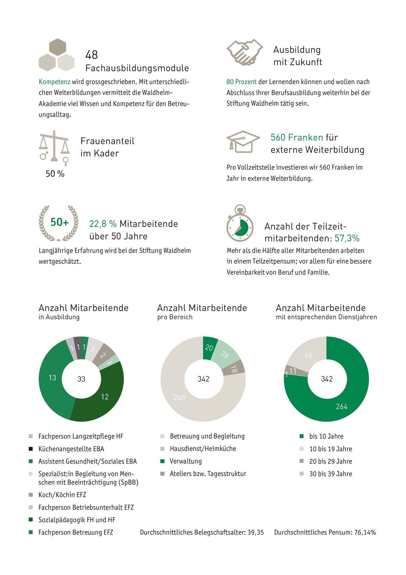 Nach der detaillierten Auswertung der Mitarbeiterumfrage sind drei Kernthemen in den Fokus gerückt: die Kommunikation, die Arbeitsbelastung und die standortübergreifende Zusammenarbeit. In diesen drei Teilbereichen haben wir die Weichen in Richtung Zukunft gestellt. Durch starke Führungsarbeit mit klaren Aufgaben, Wertschätzung, Fairness und Unterstützung möchten wir die Energie unserer Teams für das Wohlbefinden der Klientinnen und Klienten weiter fördern und Belastungsspitzen möglichst tief halten.