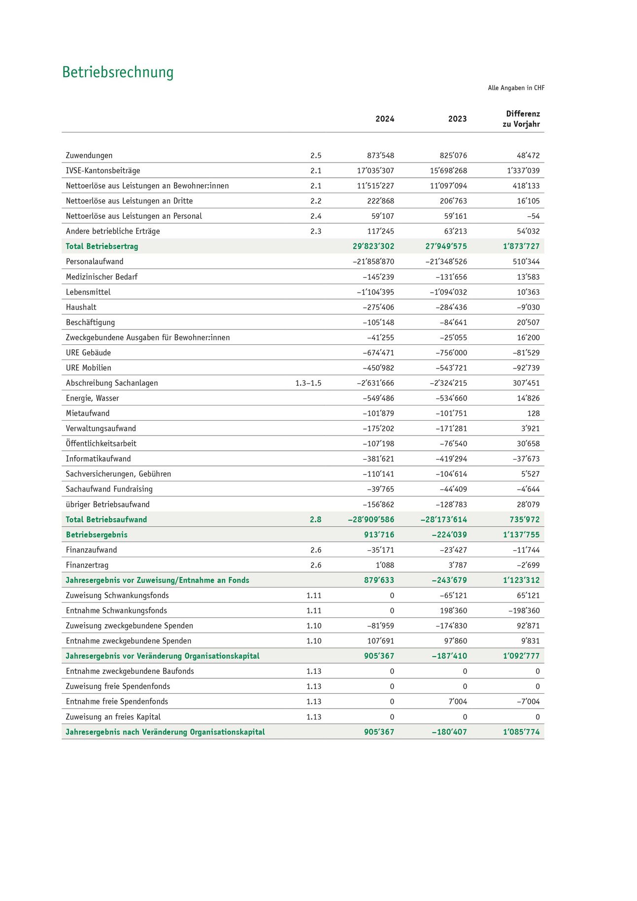 Zusammen mit diesen Fondseinlagen und Fondsentnahmen zeigt die Betriebsrechnung 2024 einen Ertragsüberschuss von CHF 905’367. Im Vorjahr war es noch ein Verlust von CHF 180’407; somit zeigt sich ein Besserabschluss von fast CHF 1,1 Mio. gegenüber dem Vorjahr.
