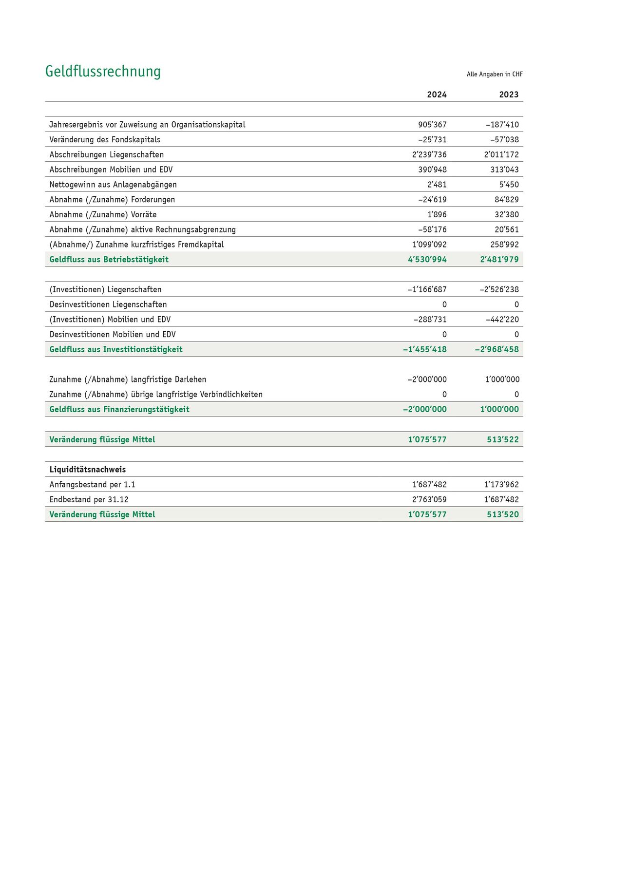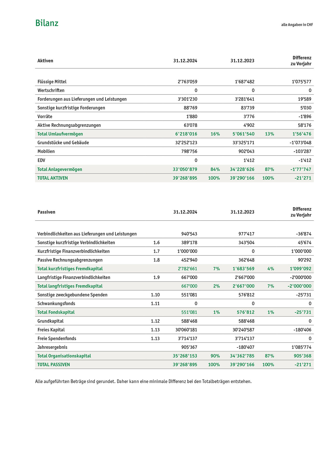 Das Organisations-Kapital steigert sich dank dem Reingewinn 2024 von CHF 905’367 auf CHF 35’268’153 und erreicht somit eine Eigenkapitalquote von 90 %.