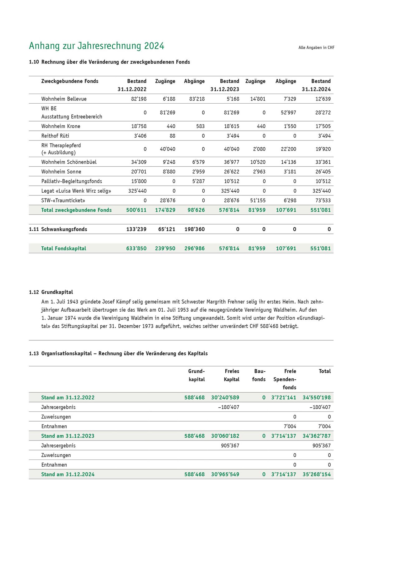 In die zweckgebundenen Fonds sowie in die freien Spendenfonds wurden netto CHF 81’959 eingelegt, und durch zweckbestimmte Verwendungen wurden CHF 107’691 entnommen.