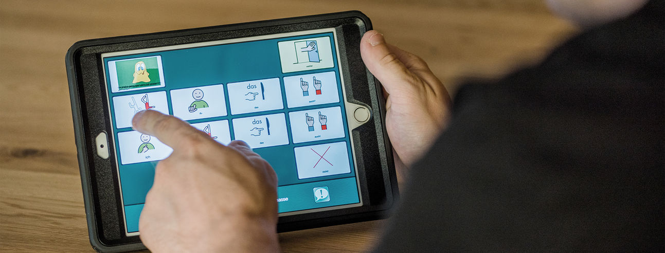 Heute übernehmen auch Tablets und Apps eine wichtige Funktion bei der Überwindung von Barrieren im Alltag. Durch das Antippen von Bildern und Symbolen lässt sich sehr vieles sehr einfach mitteilen.
