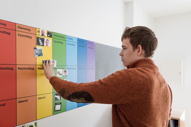 Deshalb setzt die Stiftung Waldheim die unterschiedliche Hilfsmittel ganz gezielt ein: Gebärden werden vor allem im Alltag angewandt, wenn es darum geht, einfache Wünsche und Bedürfnisse mitzuteilen wie beispielsweise «Ich will duschen», «Ich möchte trinken» oder «Ich bin müde». Jede Wohngruppe arbeitet zudem mit einer sogenannten UK-Tafel, die sowohl zeitlich als auch aktivbezogen eine bildhafte Übersicht über den aktuellen Tagesablauf ermöglicht.