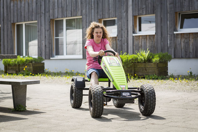 Mit strahlenden Gesichtern flitzen Bewohnerinnen und Bewohner des Wohnheims Schönenbüel mit dem Go-Kart durch den Innenhof. Das stabile Spassmobil konnte die Stiftung Waldheim mit Spendenbeiträgen finanzieren.