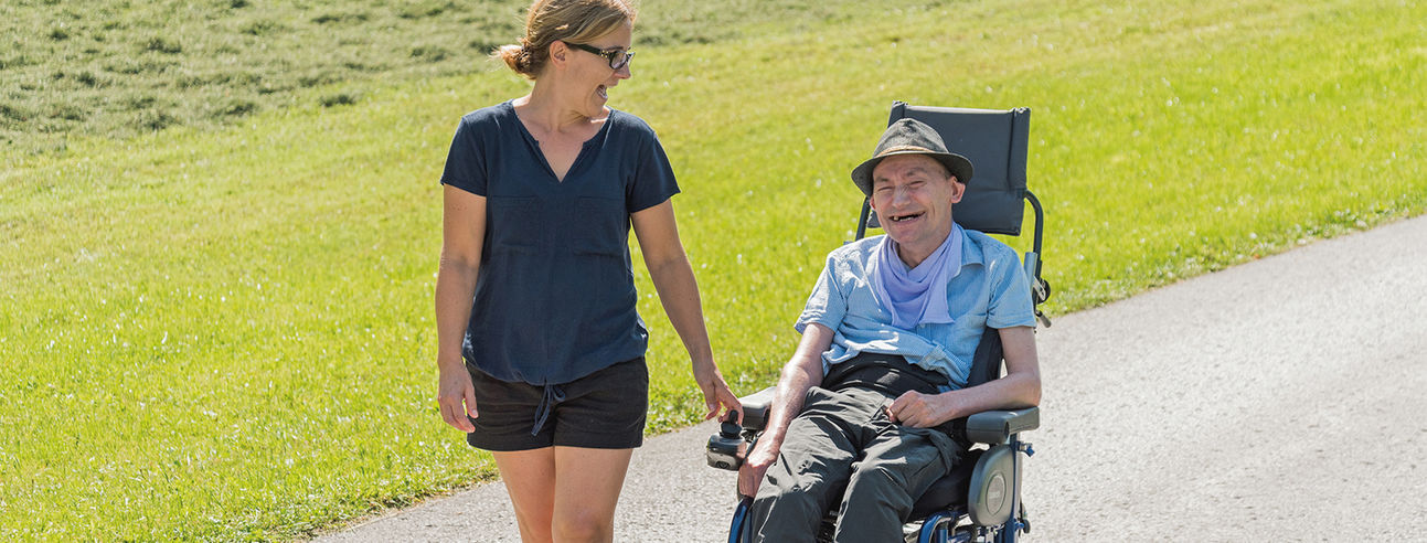 Hans-Ruedi bewegt sich im Rollstuhl in der freien Natur. Die Kräfte reichen jedoch nicht aus, um sich per Muskelkraft zu bewegen. Da bringt ein eingebauter Elektromotor natürlich eine willkommene Erleichterung. Dieses Extra an Bewegungsfreiheit konnte durch den Einsatz von Spendengeldern verwirklicht werden.